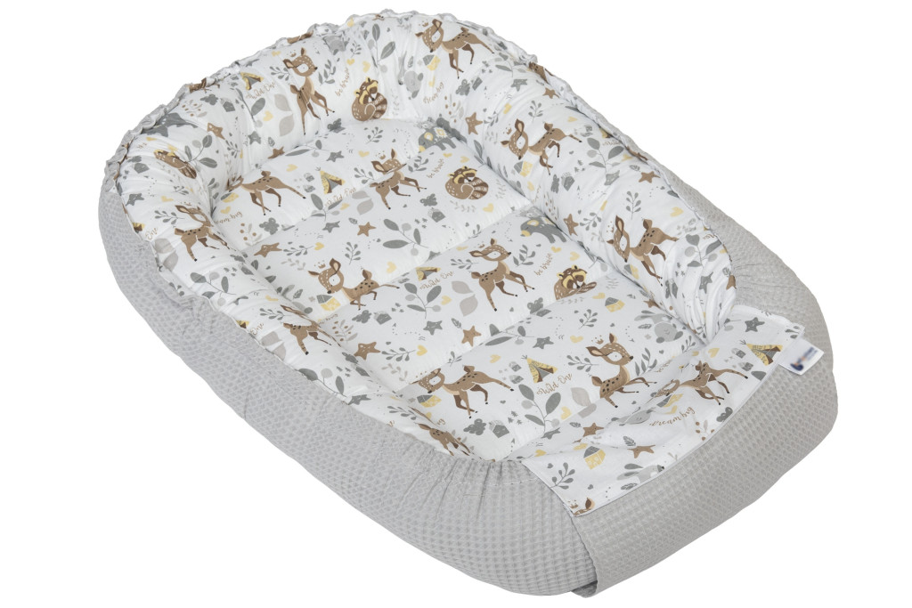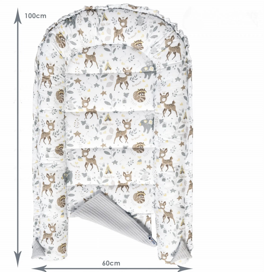 Ez a kétoldalas babafészek 100% pamut anyagból készült, és biztonságos, kuckós alvóhelyet biztosít újszülöttek számára. A megemelt, puha oldalak hipoallergén töltettel készültek, az állítható zsinór pedig lehetővé teszi a méret szabályozását. Használható kiságyban, szülői ágyban, babakocsiban vagy utazáskor, akár 7–9 hónapos korig.