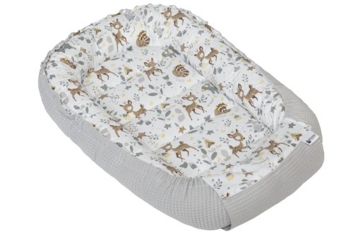 A fészek oldalai antiallergén poliészter töltettel készültek, a megemelt peremek pedig extra biztonságot nyújtanak alvás közben. A praktikus, állítható zsinór segítségével a fekvőfelület mérete szűkíthető vagy lazítható, így a babafészek a gyermek növekedéséhez igazítható, és akár 7–9 hónapos korig is használható.
