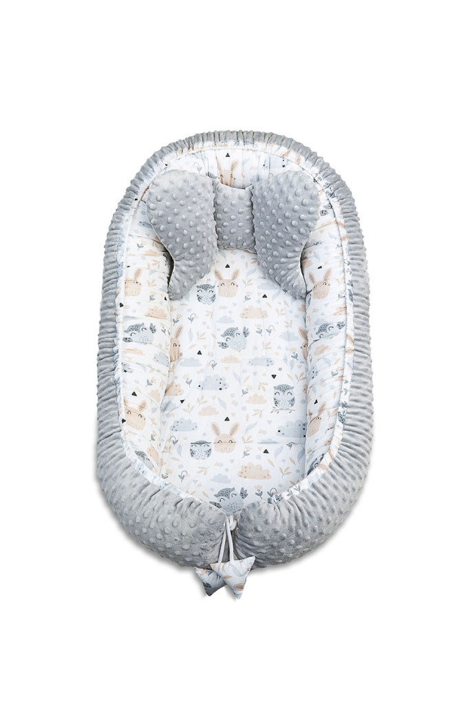 Babafészek pillangó párnával - bagoly és nyuszi - szürke minky