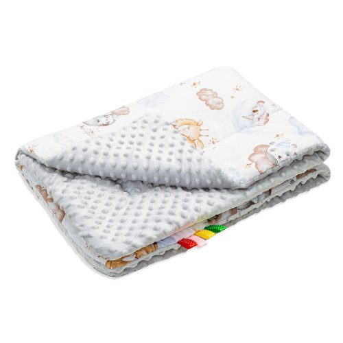Ez a kétoldalas babatakaró ideális megoldás újszülöttek és kisbabák számára, amikor fontos a kényelem, a megfelelő hőérzet és a bababarát anyaghasználat. A takaró egyik oldala 100% pamut, a másik oldala puha minky poliészter, belsejében pedig antiallergén szilikon poliészter töltet található, amely kellemes meleget biztosít a hűvösebb napokon.